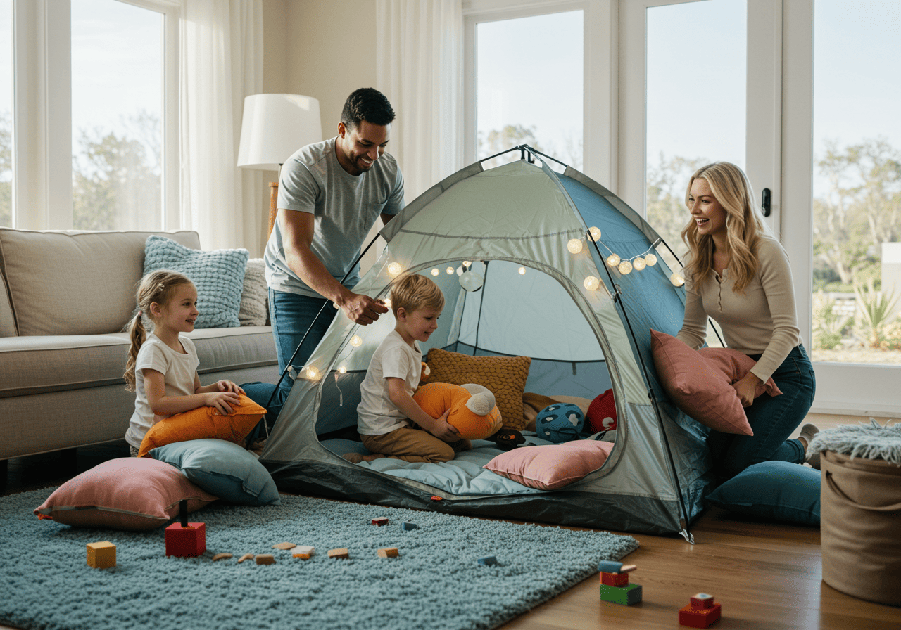 거실에 텐트를 치거나 이불로 작은 공간을 꾸며 집 안에서 캠핑 분위기를 내보세요. 조명과 간식 준비로 더욱 특별한 시간이 될 거예요.